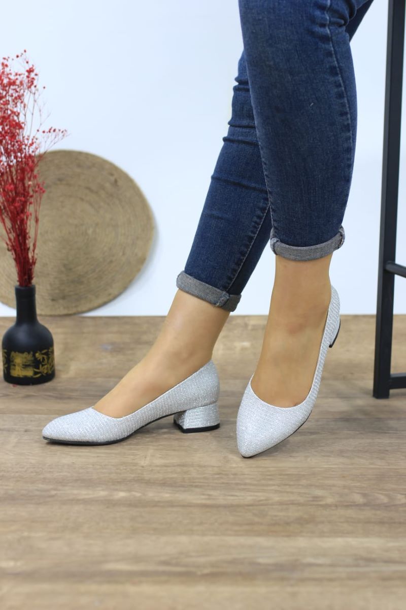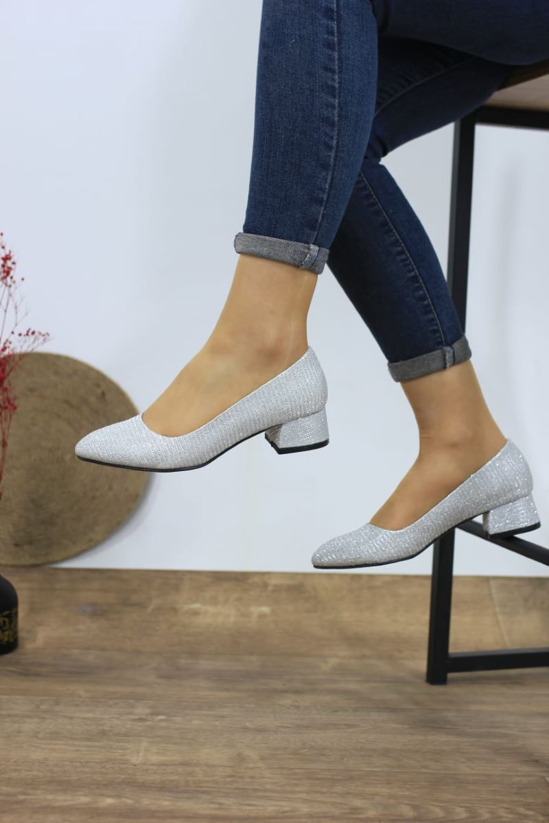 Kadın Ayakkabı Gümüş Simli Kısa Kalın Topuklu Ayakkabı 5 cm