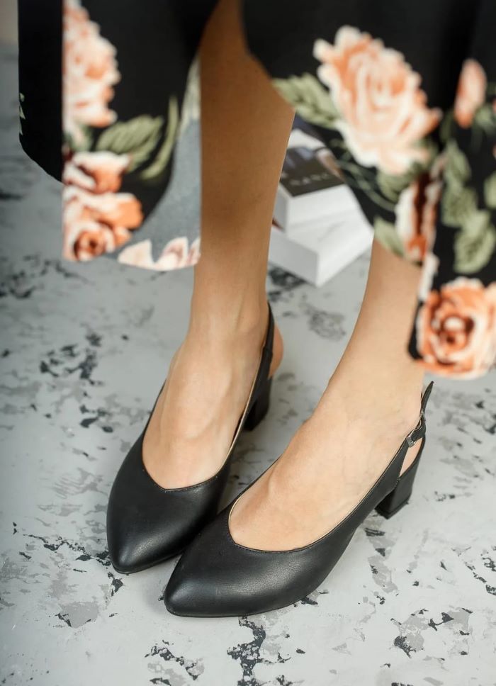 Kadın Ayakkabı Siyah Cilt Kısa Topuklu Arkası Açık Abiye Ayakkabı, ofis şıklığınızı tamamlamak için şık bir elbise veya etekle mükemmel bir uyum sağlar. Dışarıda geçireceğiniz özel bir akşam yemeği veya davetlerde de tercih edebilirsiniz. Kot pantolon veya şort ile kombinleyerek gündelik bir görünüm elde edebilirsiniz.
