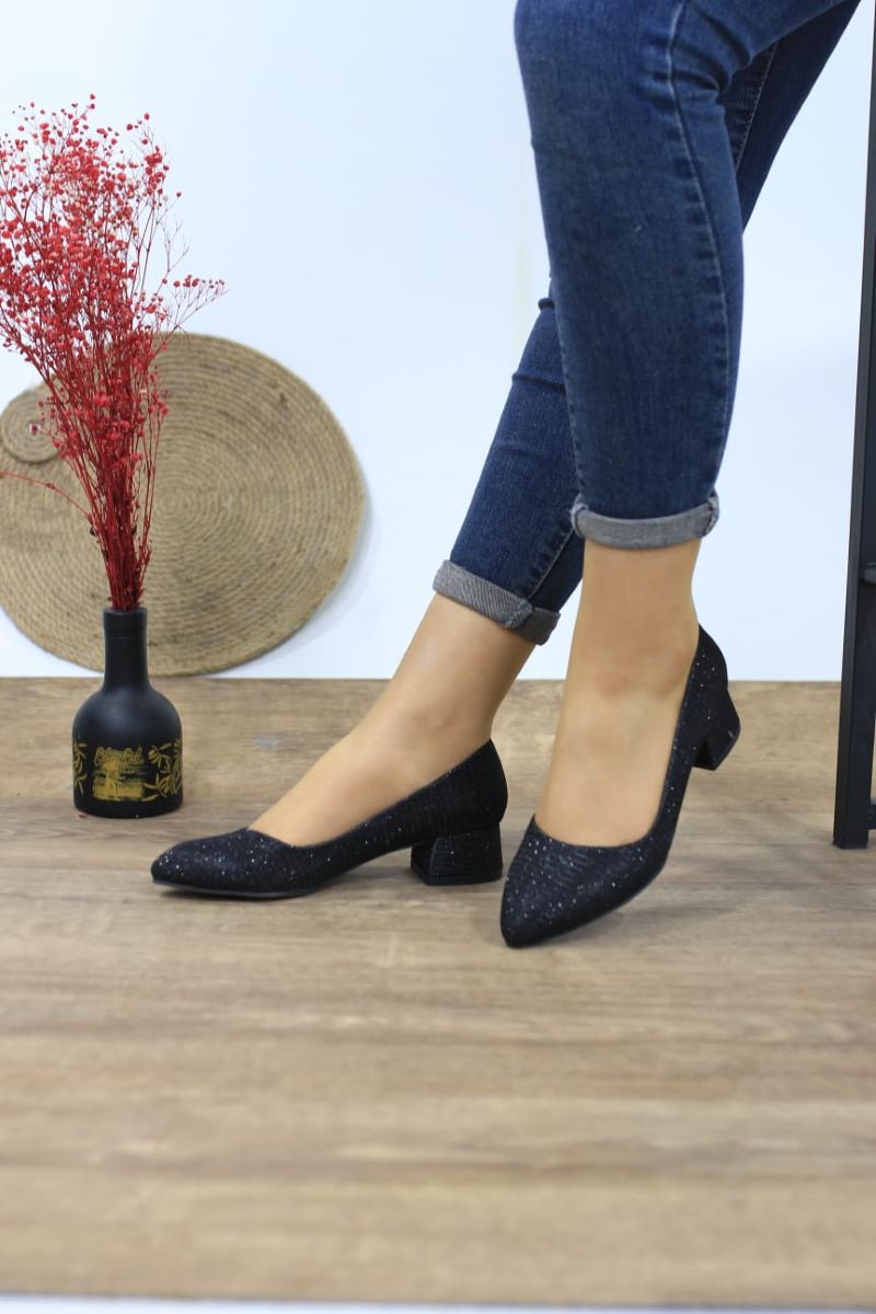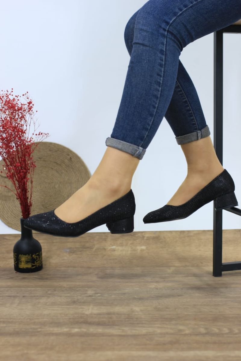 Kadın Ayakkabı Siyah Simli Kısa Kalın Topuklu Ayakkabı 3cm
