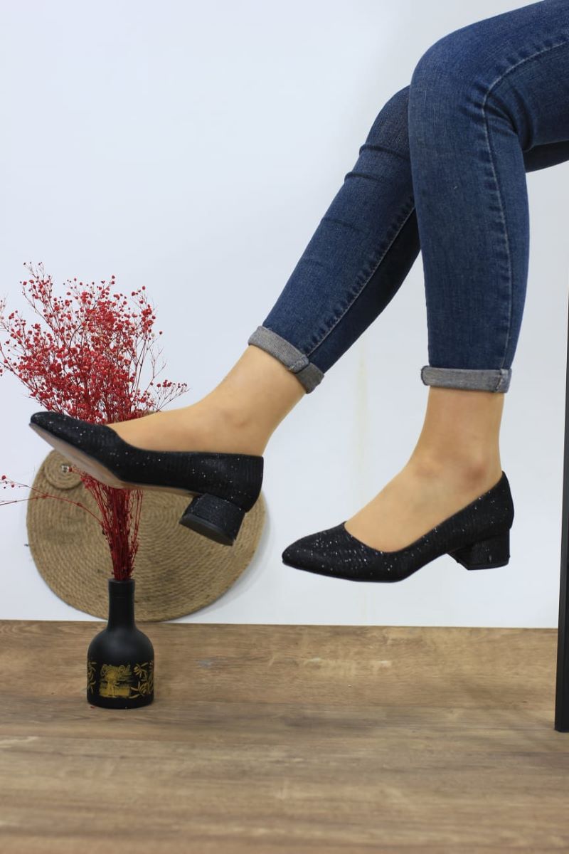 Kadın Ayakkabı Siyah Simli Kısa Kalın Topuklu Ayakkabı 3cm, zarif görünümü, konforu ve dayanıklı yapısıyla dolabınızdaki yerini alacak. Farklı tarzlara hitap eden bu ayakkabıyla, hem her gün hem de özel anlarınızda şıklığınızı tamamlayabilirsiniz. Modanın öncüsü olma yolunda bir adım atmak için şimdi sipariş verin!